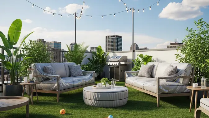Rumput sintetis bisa digunakan sebagai alas yang nyaman, memberi kesan alami tanpa perawatan rumput asli. Tanaman hias gantung juga dapat menjadi pilihan yang menarik, menambah dimensi vertikal tanpa mengambil banyak tempat.