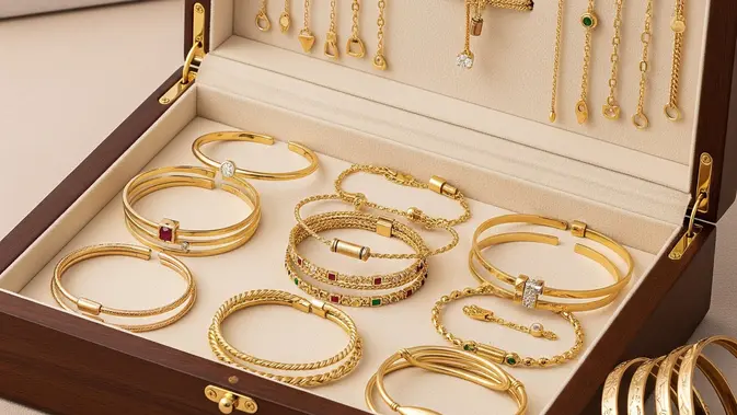 Penyimpanan yang tepat juga berpengaruh pada keawetan perhiasan. Simpan gelang di tempat kering dan tertutup untuk mencegahnya terkena goresan dan kerusakan akibat faktor lingkungan.